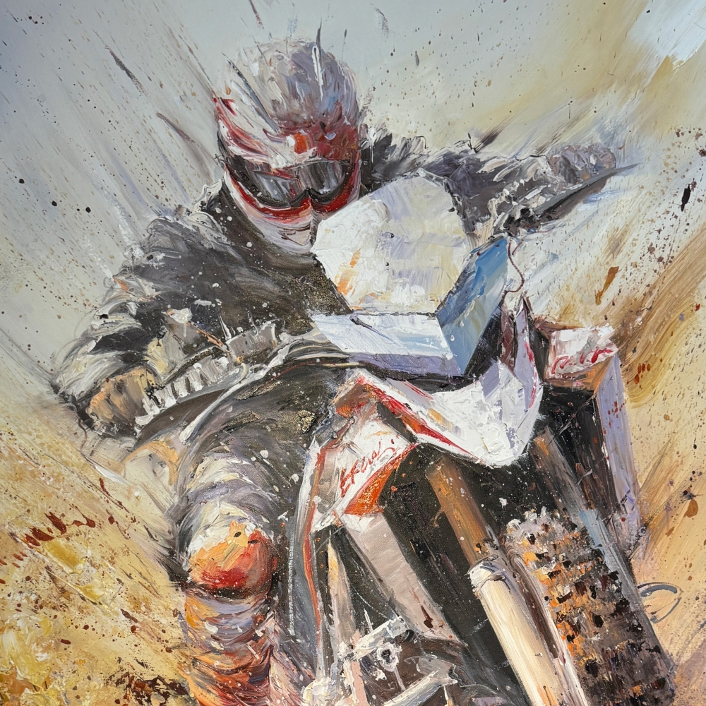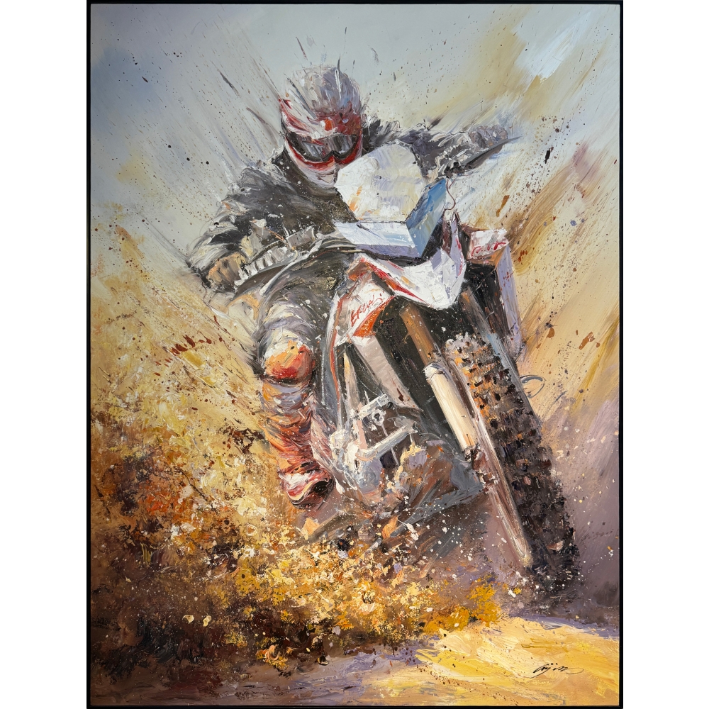 帶著全罩與身著皮衣的騎士在越野賽道的過程中,展現出塵土飛揚也底擋不住的帥氣魅力,是一幅很有氣勢的畫。