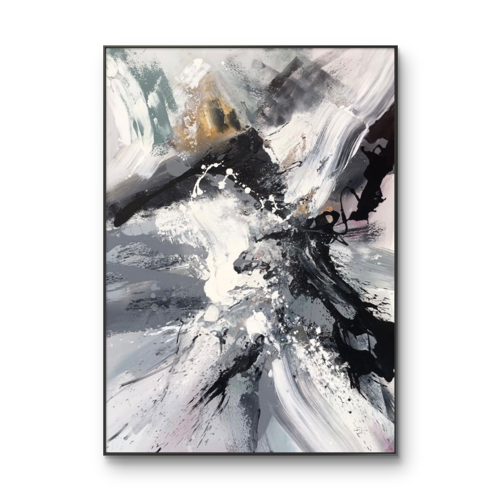 黑墨中閃耀的色彩,衝突中尋找平衡。使用黑、白、灰等中性色為基底,用金色、綠色、與粉紫色做點綴並增添此幅畫的色彩,