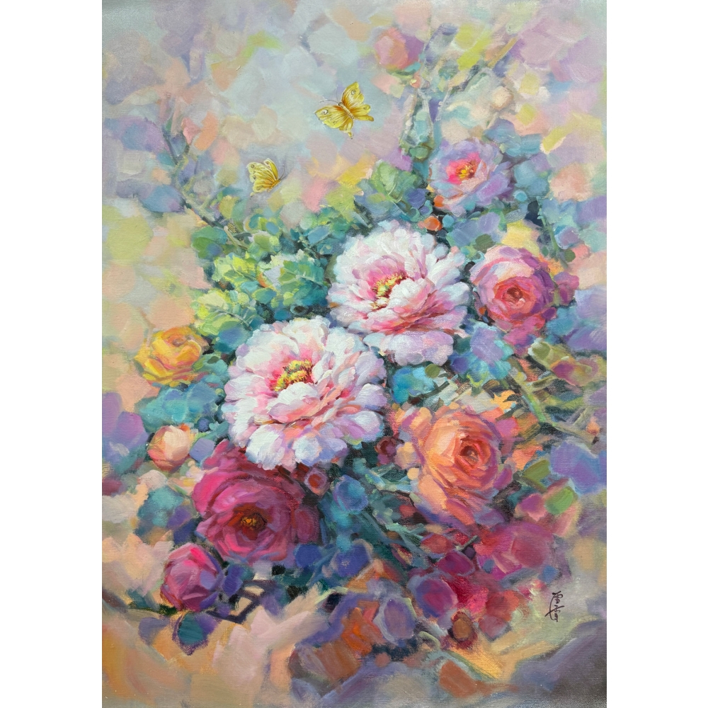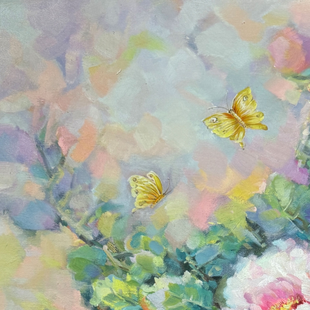 畫家將翩翩飛舞的蝴蝶點綴在牡丹上方,