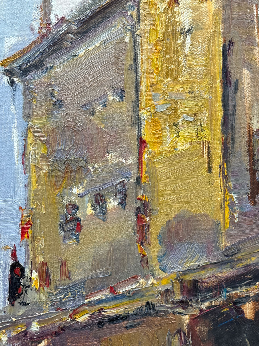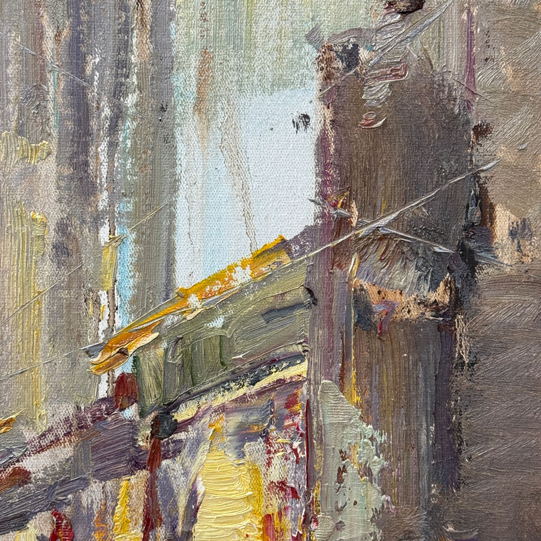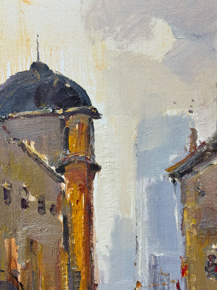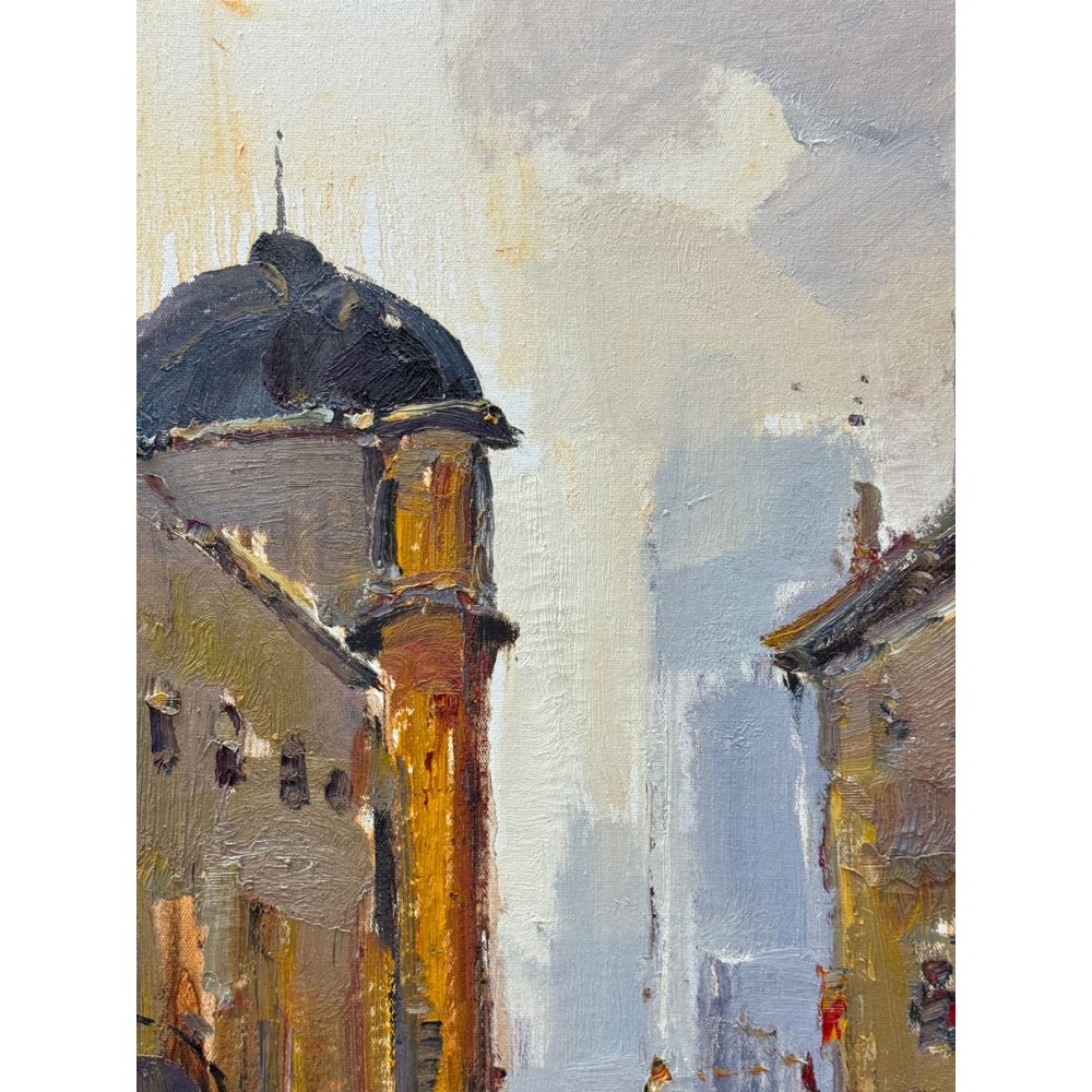有層次堆疊的塗法,將灰色調的街與暖色調的光線結合成有質感的歐式街景。
