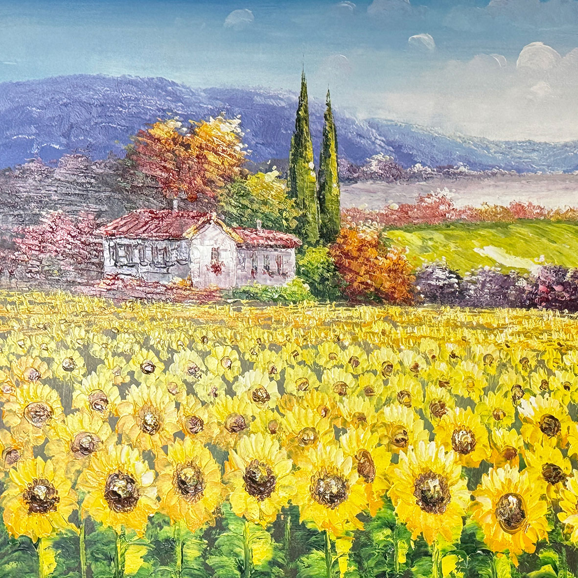 背景是法式農村的感覺,湖水、小樹叢帶著浪漫的紫色元素,前面明亮的向日葵展現出朝氣蓬勃的感覺。