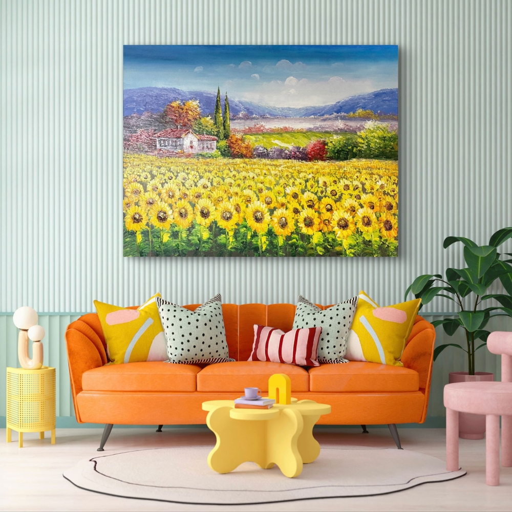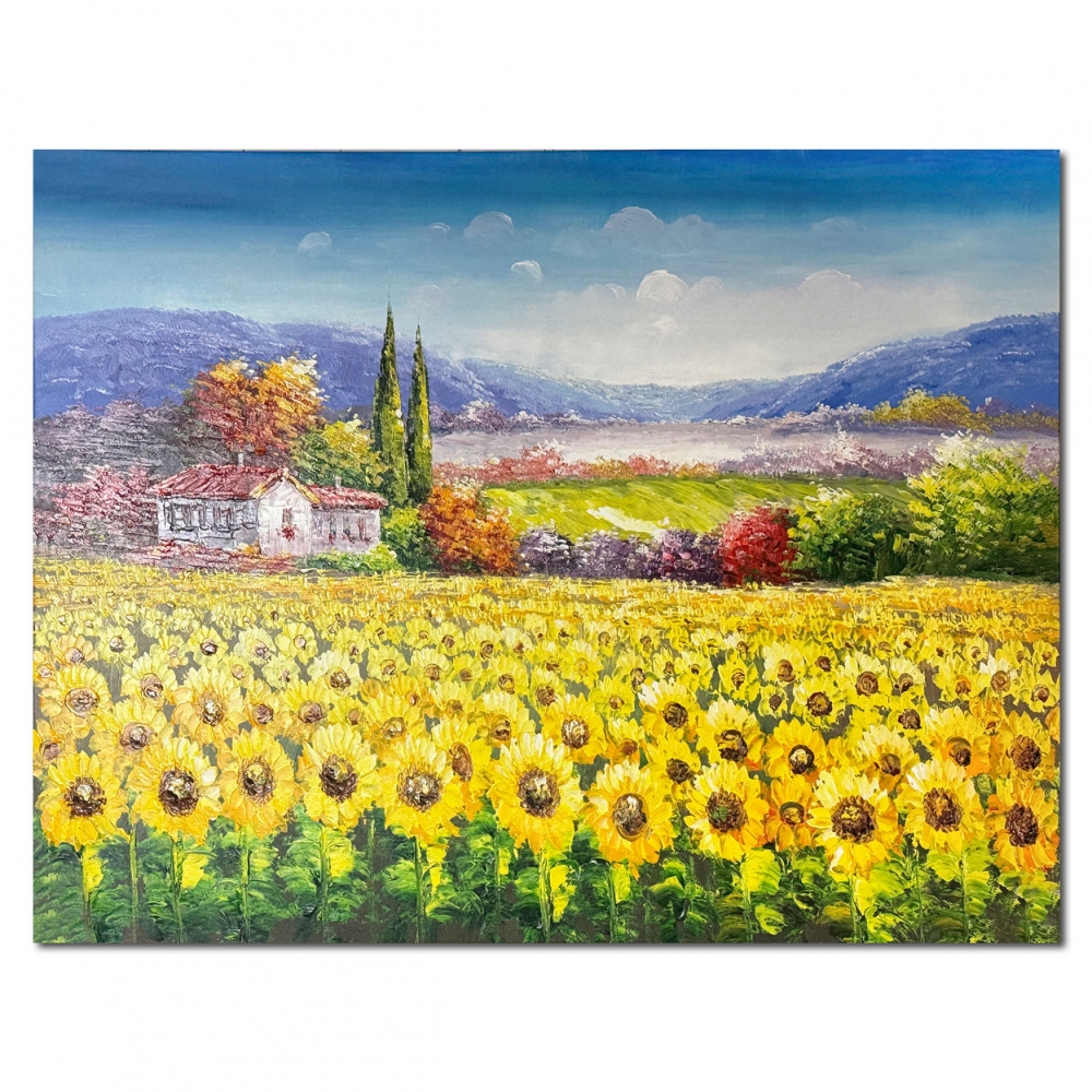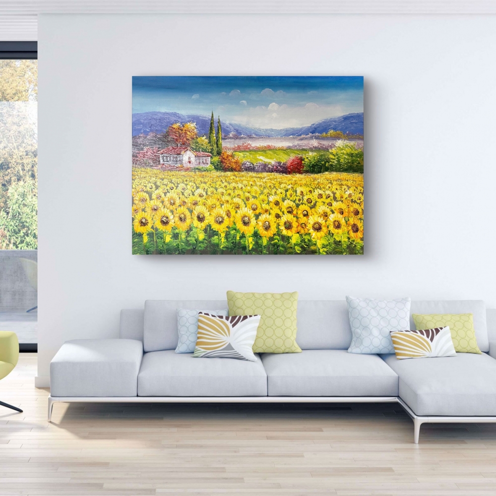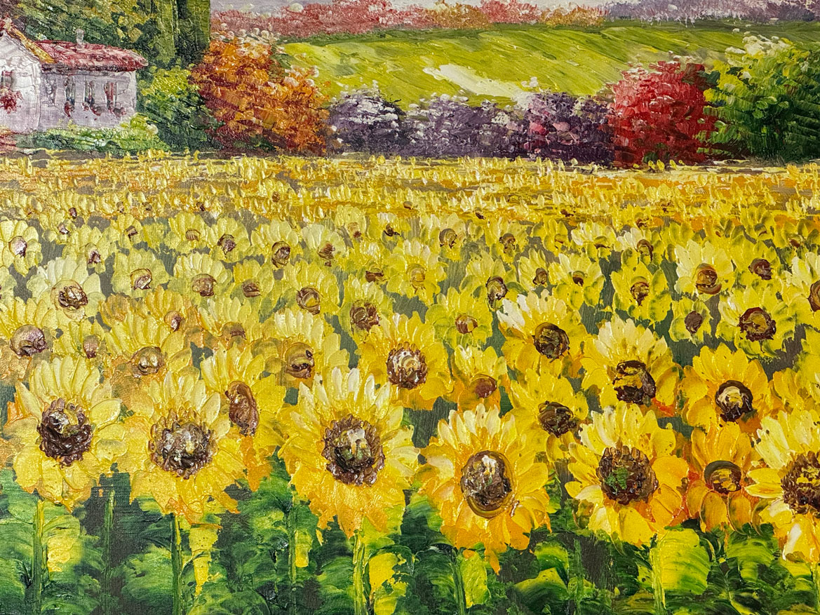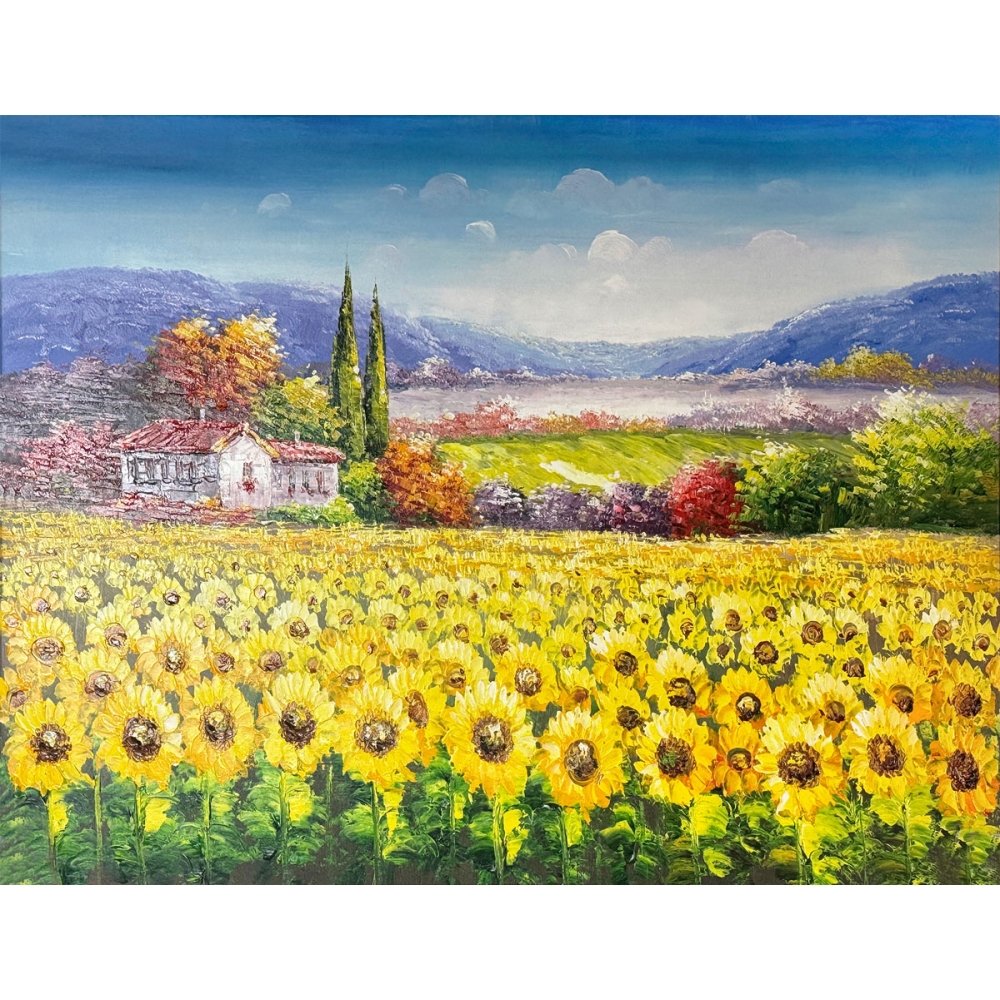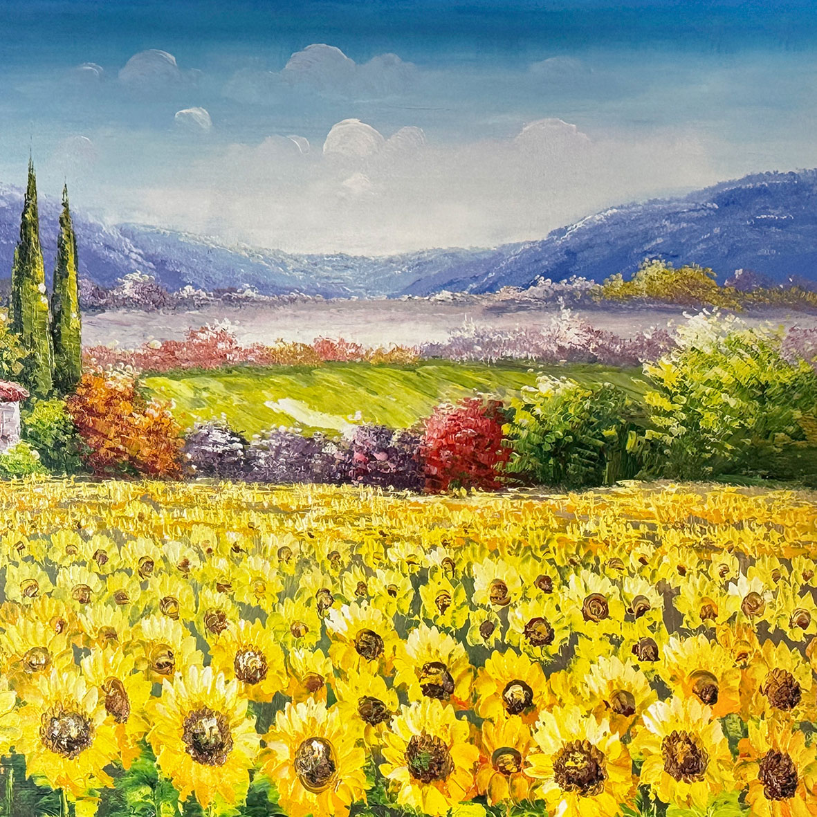 明亮的向日葵與詩意的山、湖水與小樹叢,