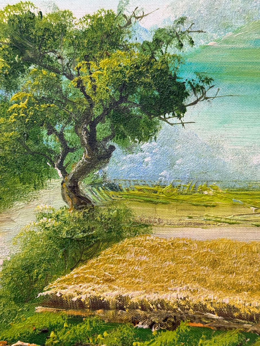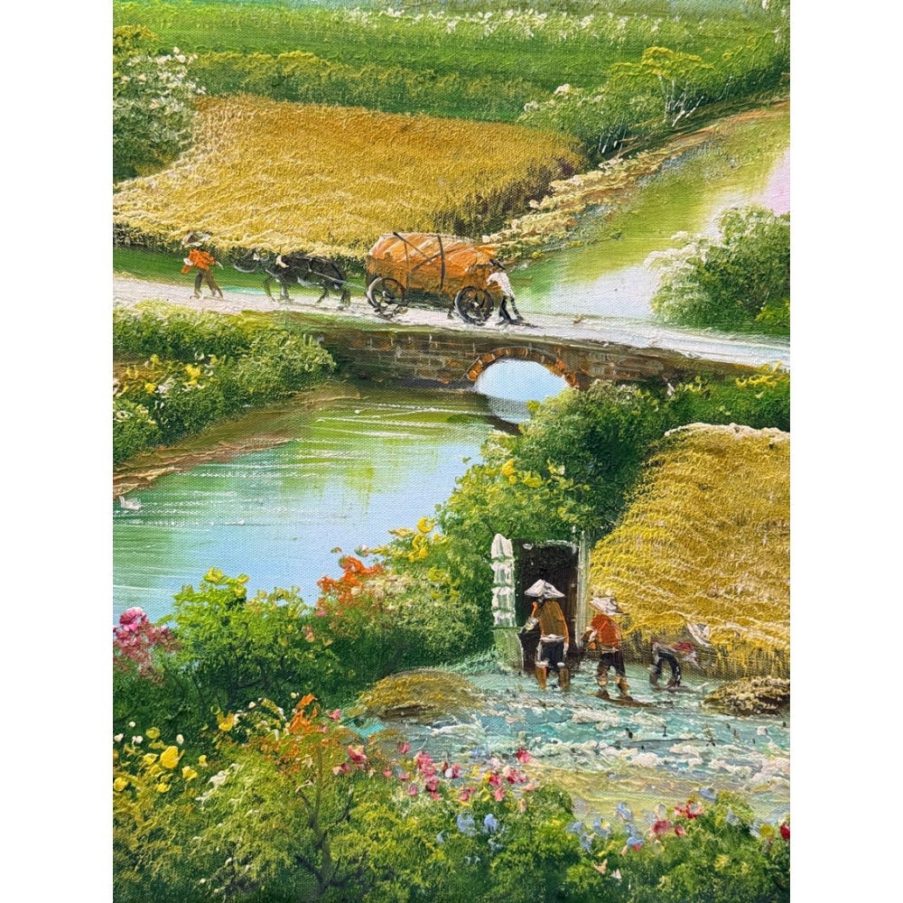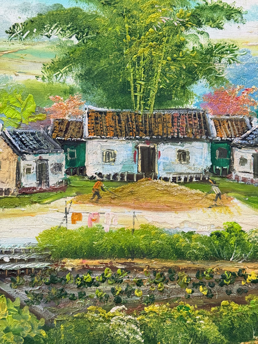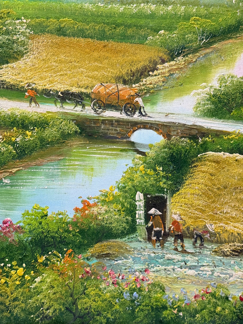 畫的稻田象徵豐收與繁榮,農忙中的居民拉著牛車、整理豐收的稻子,充滿和樂與喜悅的氣象。