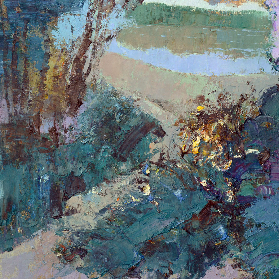 畫面中以層層堆疊的筆觸構築出遠方的湖水、微霧般的天空與濃密的樹叢。