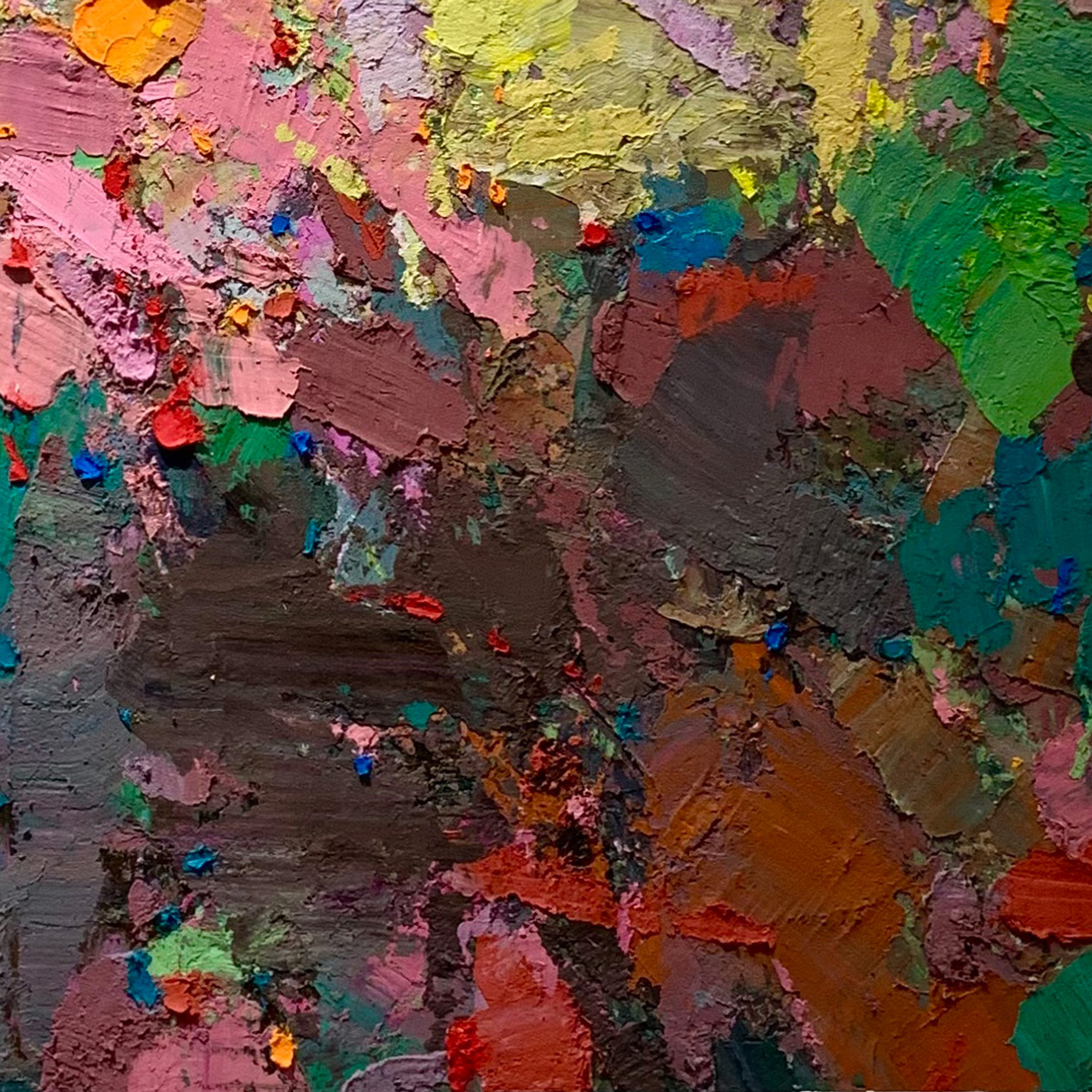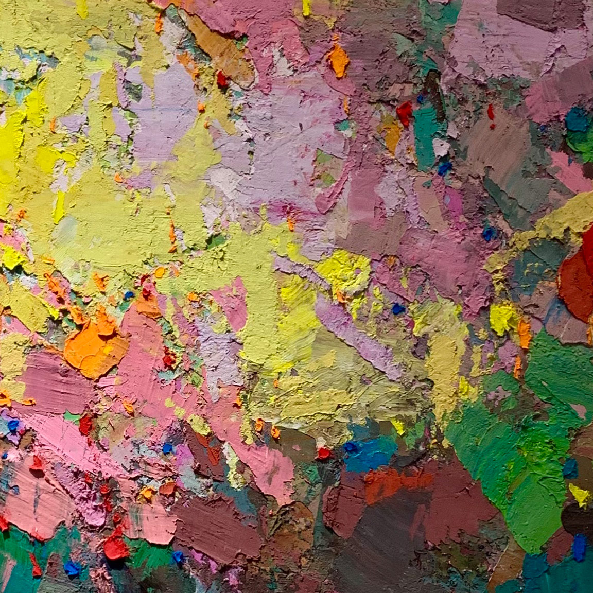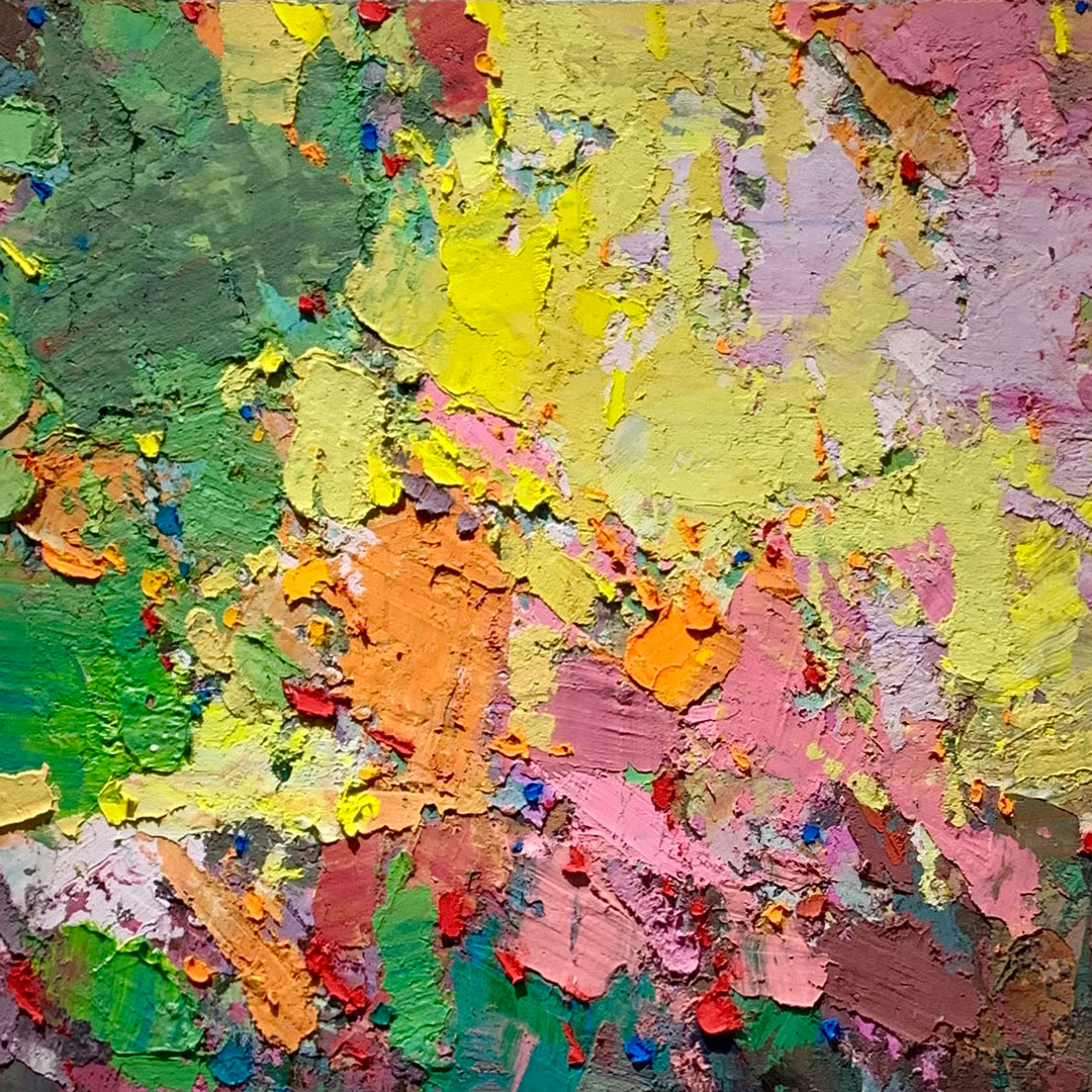 厚塗的顏料構築出豐富的肌理,大膽地堆疊、刮抹,繪出眼前繽紛動人的畫作。
