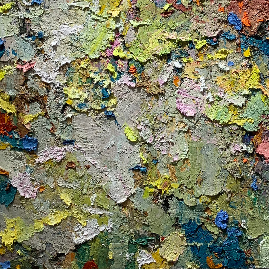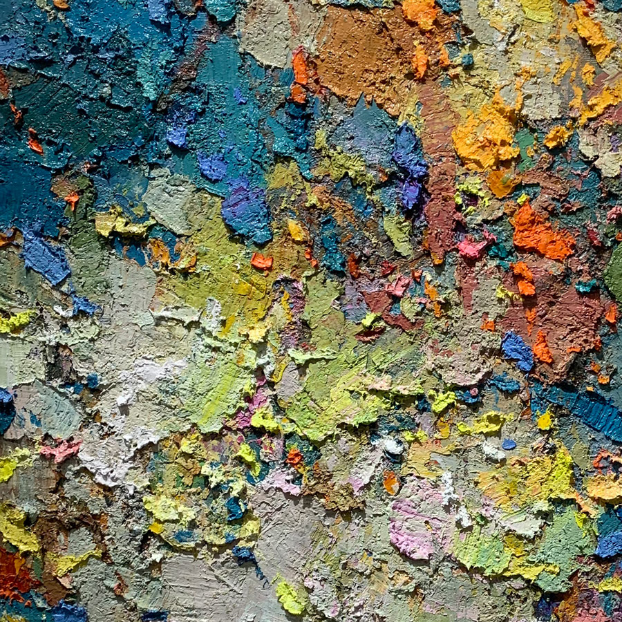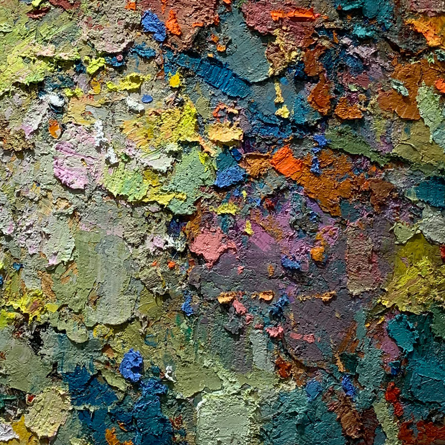 厚塗的顏料構築出豐富的肌理,大膽地堆疊、刮抹,繪出眼前繽紛動人的畫作。