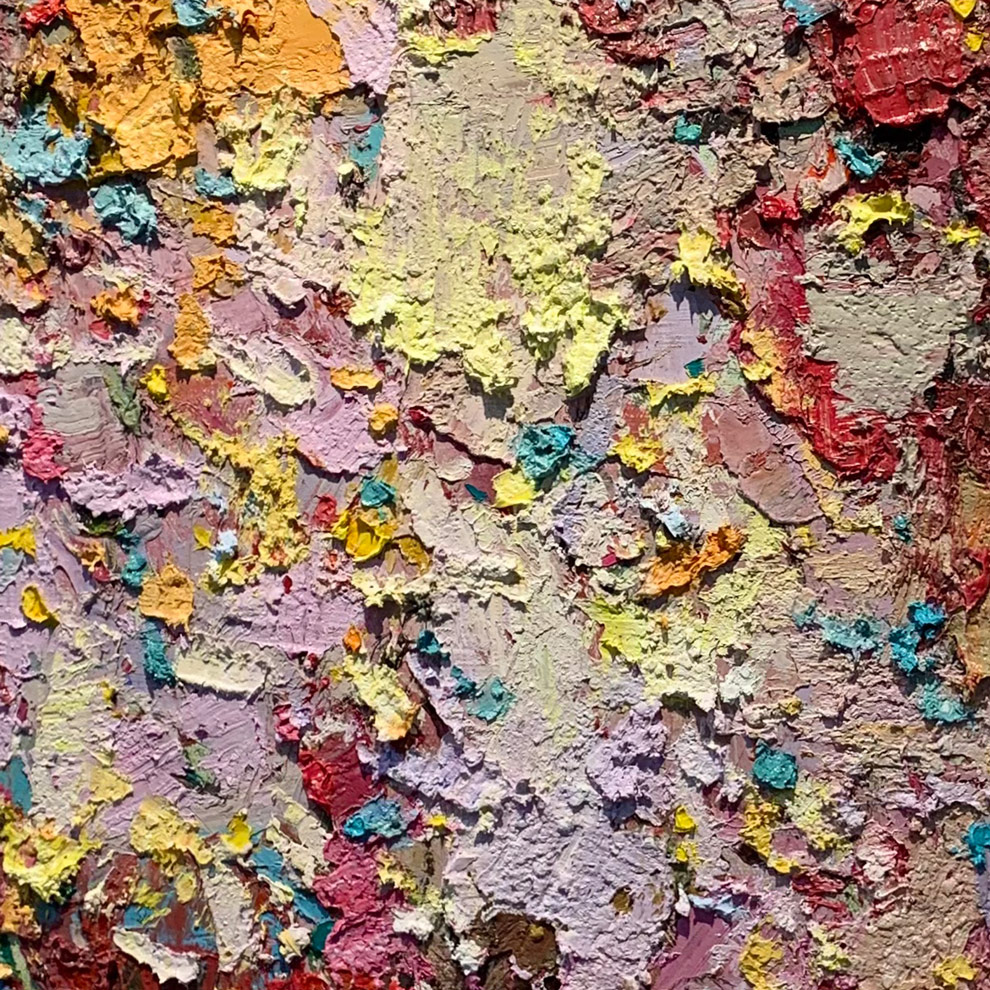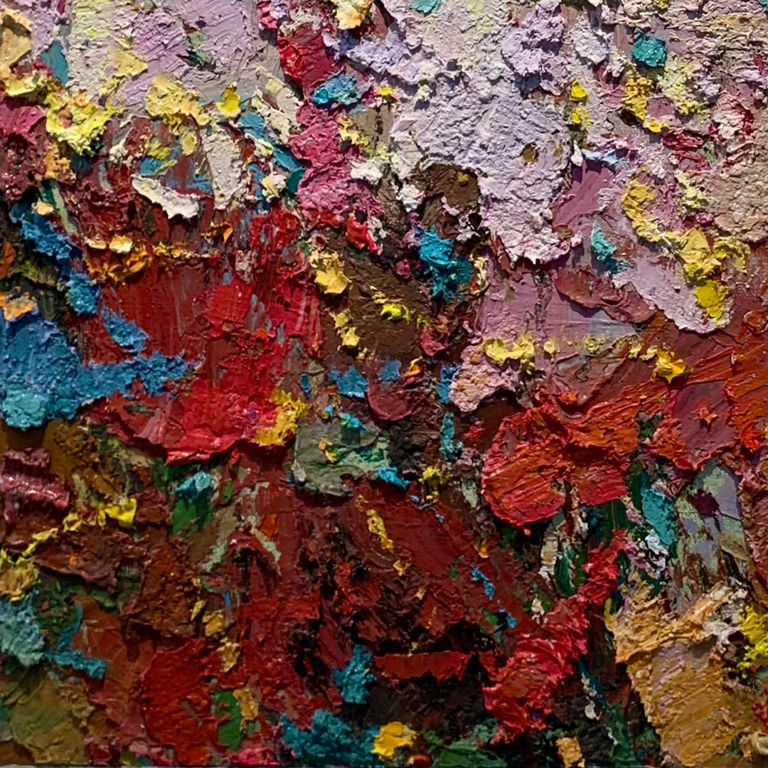 厚塗的顏料構築出豐富的肌理,大膽地堆疊、刮抹,繪出眼前繽紛動人的畫作。